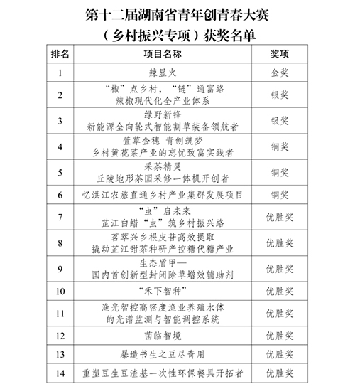 本届大赛由共青团湖南省委、省教育厅、省财政厅等12家单位联合主办,以“弘扬创业精神、服务乡村振兴”为主题,经市州推荐、省级初审及盲审初评等多轮遴选,仅200个项目入围决赛。乡村振兴专项赛最终评选出金奖1项、银奖2项、铜奖3项、优胜奖8项。彭剑的项目因创新性强、实践扎实、社会价值突出,从激烈竞争中脱颖而出。