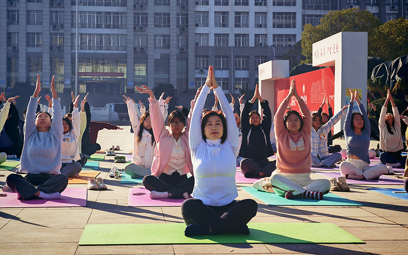 11月30日上午,在清晨的阳光中,一场名为“‘瑜’见校园,‘锦’彩周末”的户外瑜伽活动在英国上市官网365明德楼广场举行。该活动由普爱医学院“健康+”协会组织,吸引了约50名学生参与。