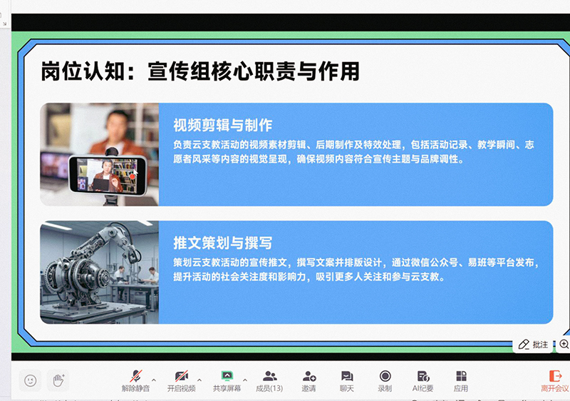 在随后的面试环节中,报名学生依次展示个人能力与岗位理解,围绕文字表达、视频剪辑、排版设计、组织协调等不同岗位需求进行应答。评委根据岗位要求进行综合评价与指导。参与培训与面试的学生表示,通过系统学习与演练,增强了对云支教服务的认识与实操能力。