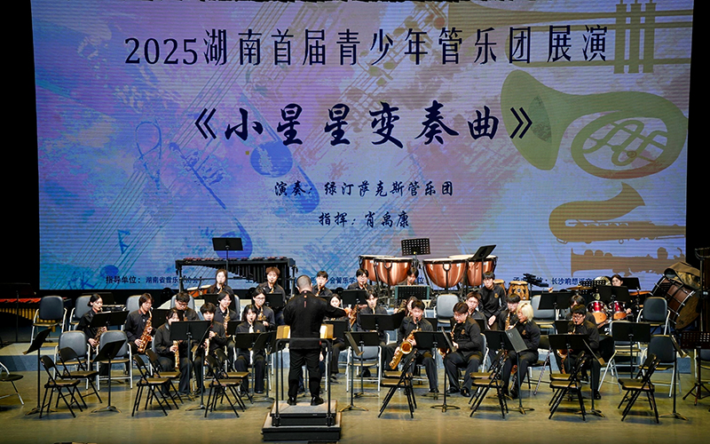展演中,绿汀萨克斯管乐团在肖禹康老师指导下,挑战了高难度曲目《小星星变奏曲》。该作品包含大量复杂的变奏段落,对乐团的音准、节奏统一性、声部平衡及音乐表现力构成严峻考验。乐团成员以饱满的热情和扎实的功底,成功演绎了这首技巧艰深的作品。湖南省管乐学会会长张鹏评价道:“绿汀萨克斯管乐团在肖禹康老师的指导下,训练成果显著:声部完整、音色统一、节奏精准、演奏富有张力和层次感,展现出指导老师出色的训练水平和乐团极高的专业素养,实属难得!”